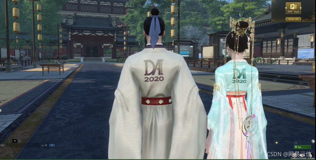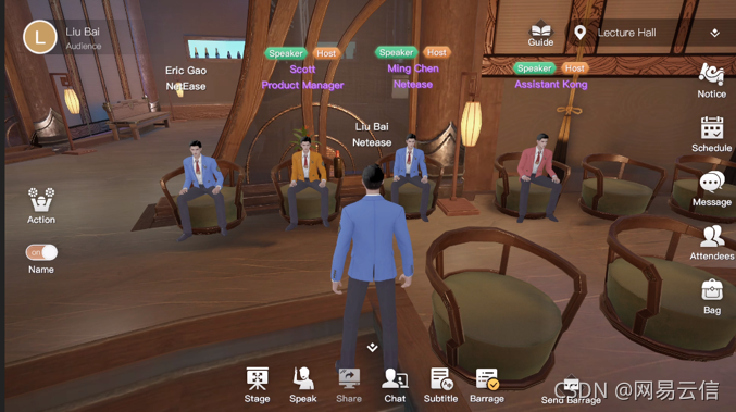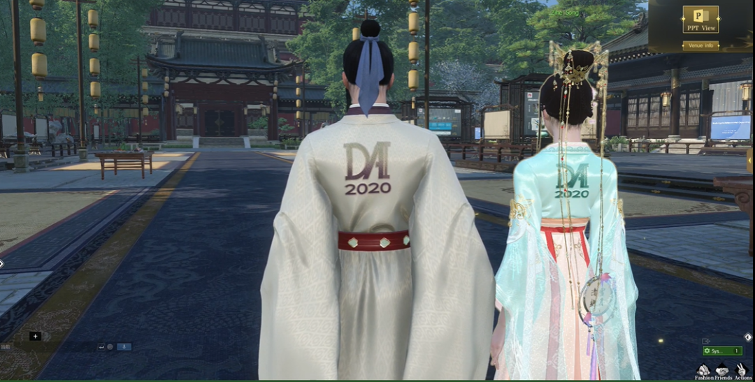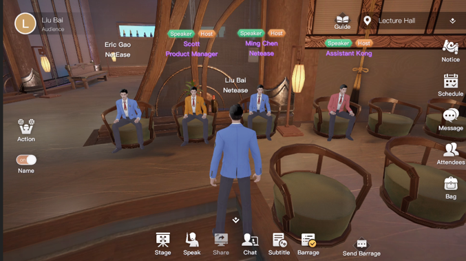 同时,为了增强会议的互动性和体验感,“瑶台”不仅同步实现了 PPT 嵌入式播放、文字和语音聊天、同声翻译、多个分会场自由切换等数十项会议功能,而且为了满足了会议社交需求,无需加群,虚拟人见面就能开启群聊。