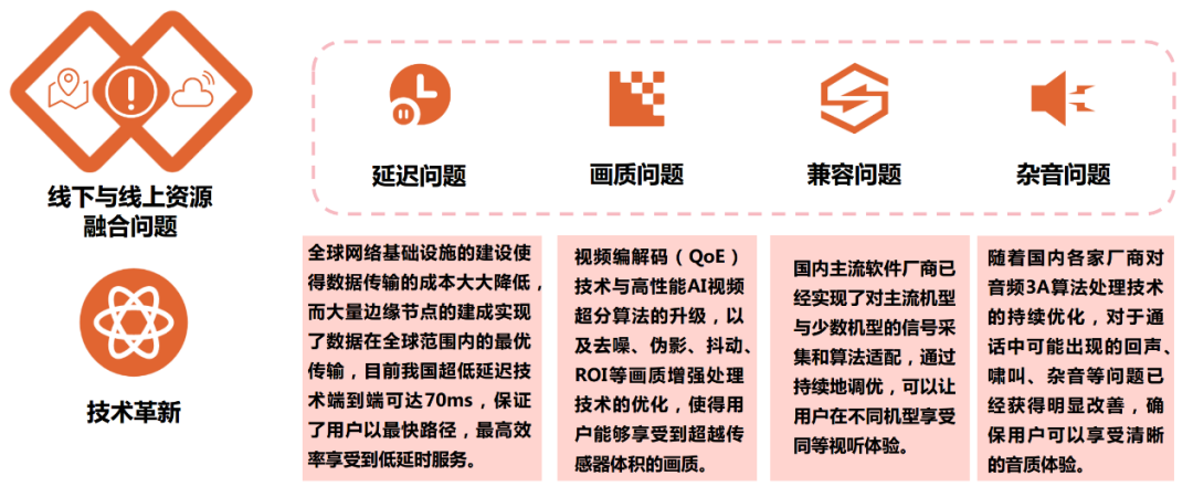 解决这个问题,需要泛娱乐行业技术层、硬件层、应用层的厂商共同努力,才能在应用技术基础中有所突破。报告将以上难点归结于延迟、画质、兼容、杂音四个核心问题。