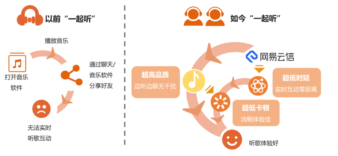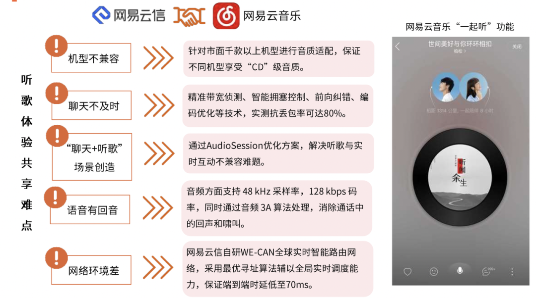 这背后离不开网易云音乐持续不断的玩法创新和网易云信的技术能力积累。基于网易云信的音视频技术,双方不断摸索和优化解决方案,共同攻克机型不兼容、聊天不及时、“ 聊天+听歌”场景创造、语音有回音、网络环境差五大技术难题。