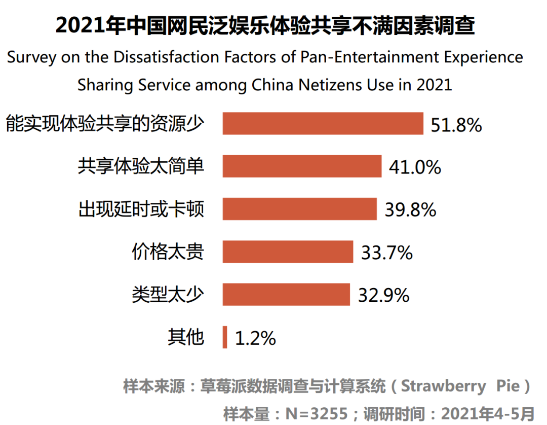但报告也指出,「体验共享」处于发展初期,需要更强大的技术和资本支持,在内容资源和服务模式上进行优化。而线上娱乐的体验不好、难沟通是当前用户的普遍痛点。尤其是“使用体验卡顿”和“单人参与乐趣不足”两个方面,成为行业发展首要解决的问题。