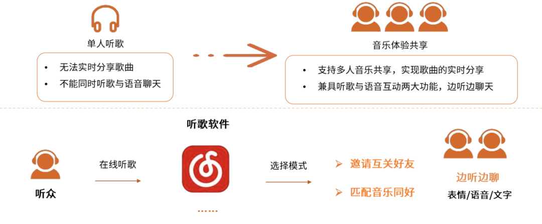 与电影「体验共享」类似,音乐「体验共享」的主要方式同样是邀请互关好友,或匹配音乐同好。用户需要先在单人听歌界面转发至群聊内或是给朋友,或是通过软件内邀请朋友加入,从而一起听歌。并且软件内提供语音功能,使得用户可以实时交流。