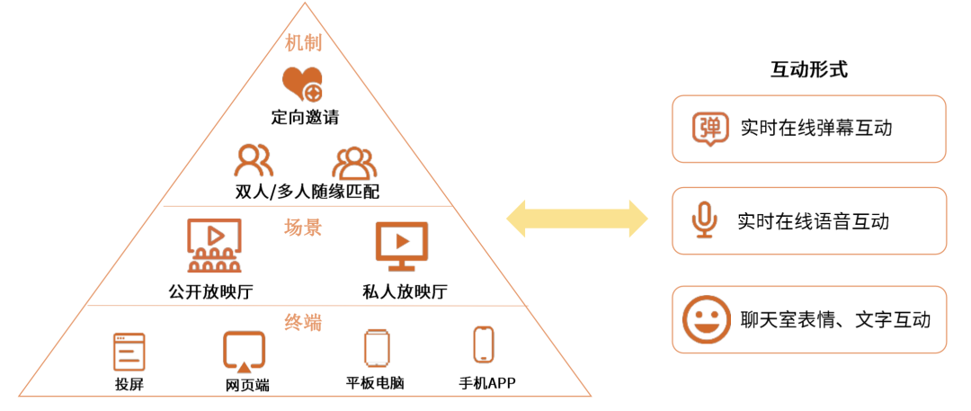 微光APP在这一场景中搭建了一个既能满足熟人社交(异地恋一起看电影等),又能实现陌生人社交(随机匹配、根据共同爱好匹配等)的多维度互动社交 APP,可以打破传统电影院的时空桎梏,提升用户观影体验。