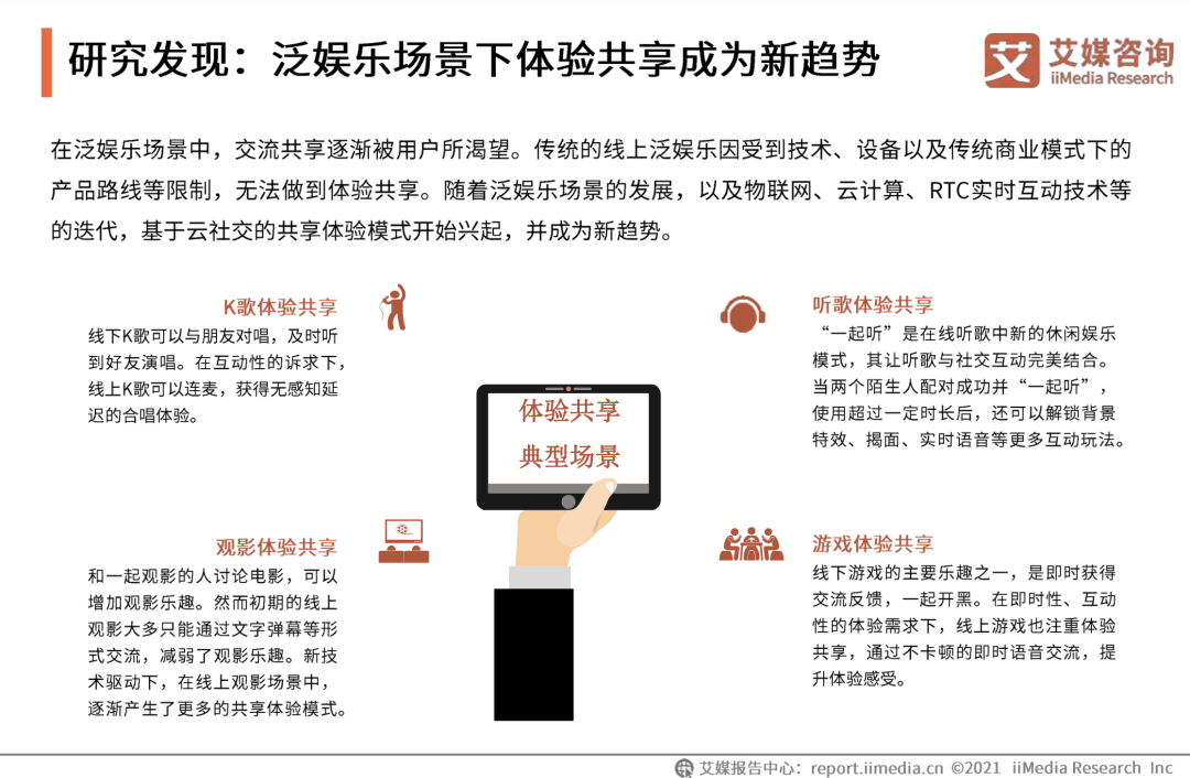 《2021 年中国泛娱乐行业体验共享专题报告》中,艾媒咨询分析了中国K歌、电影、开黑、音乐四大板块体验共享的应用场景和案例,针对应用模式变革、应用价值、用户使用情况进行了具体的解读。