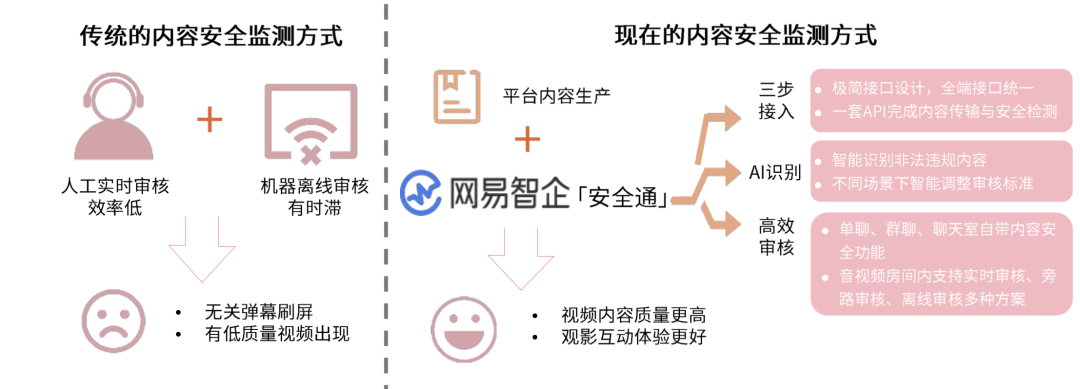 当未来一阶段“高频互动”、“隐私保护”、“监管合规”成为行业主要特征时,这就更需要应用平台重视技术的服务质量和内容的安全审核。比如在监管合规方面,网易智企推出了应用于 IM、RTC、直播点播三大场景的安全通信产品——「安全通」,内容传输和安全检测两大问题一站解决。