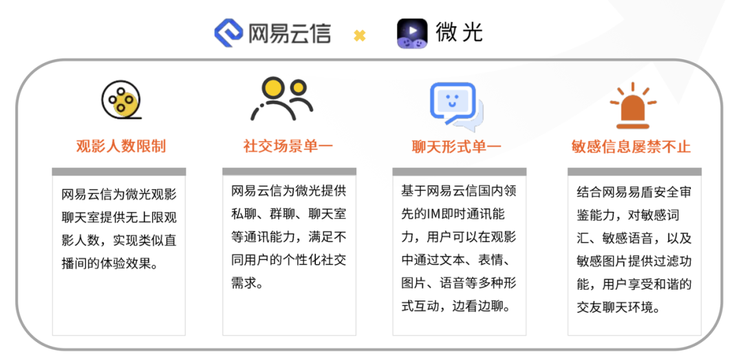 但是目前在线观影体验中面临诸多难题,例如人数受限、社交场景单一、聊天形式单一以及敏感信息屡禁不止等。面对这些难题,网易云信针对性地进行了不同程度的优化,助力微光保障用户体验、进行玩法创新,进而提升用户满意度和留存率。