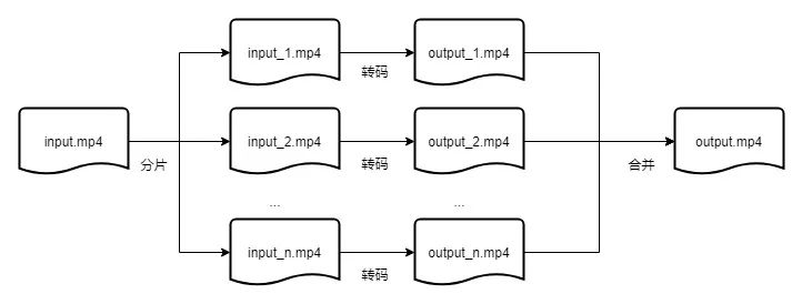 提升硬件能力、优化编码这两个维度是针对提升单个转码进程的计算效率,但是单进程能调用的资源有限,对大视频文件的速率提升也是很有限。因此,在这里我们探讨如何采用分布式 MapReduce 的思想,缩短一个转码任务所消耗的时间。接下来的章节将详细讲述实现分片转码技术方案。
