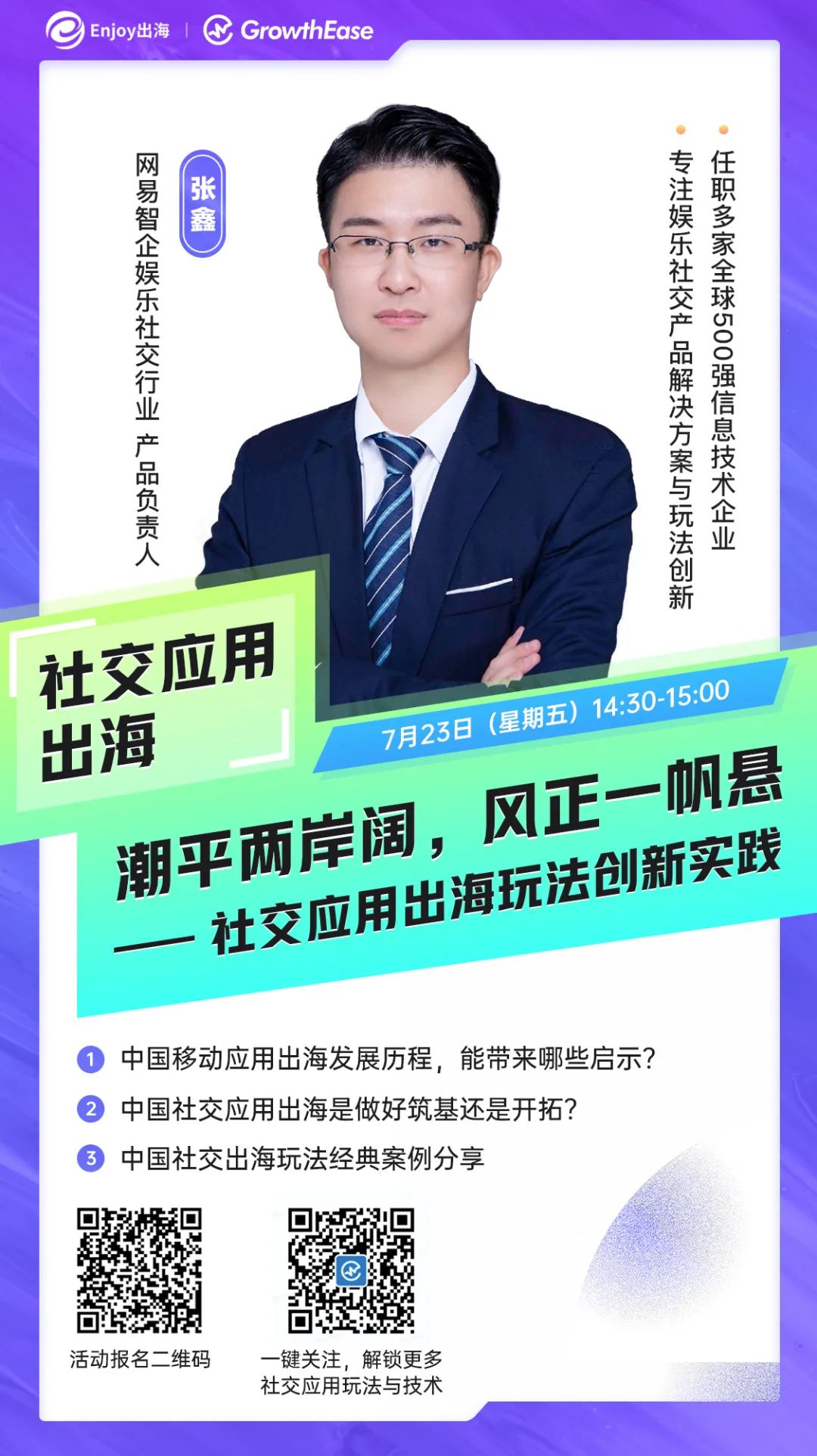 如果您也对以上难题困惑,那么这场活动就不可错过。由 Enjoy 出海主办的 2021 GGDS Summer Summit 已于今日正式拉开帷幕。7 月 23 日 14:30~15:00,网易智企娱乐社交行业产品负责人张鑫将带来主题为《潮平两岸阔,风正一帆悬——社交应用出海玩法创新实践》的分享。