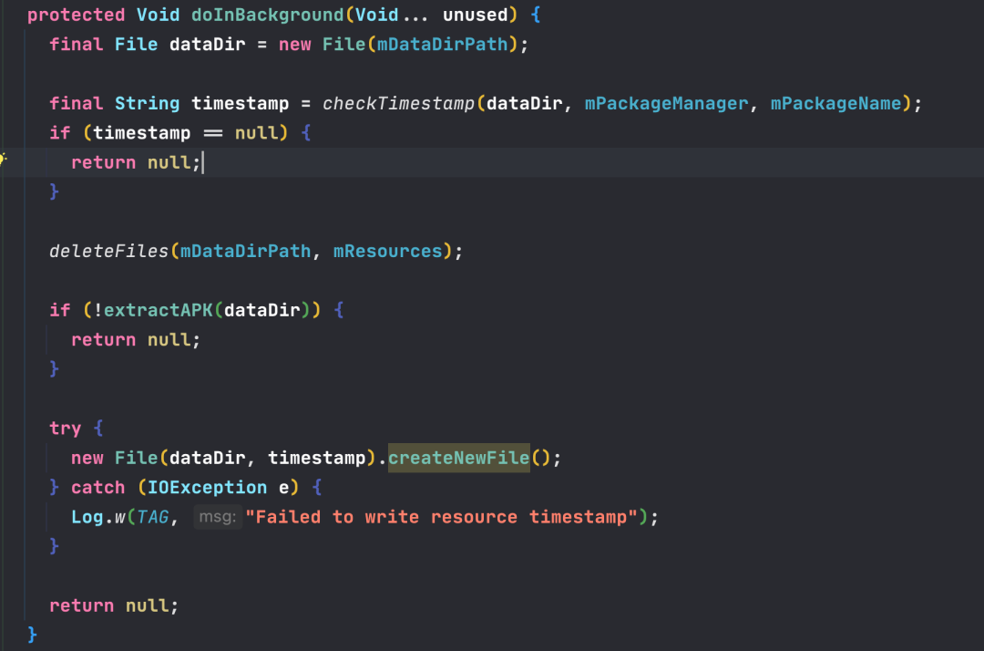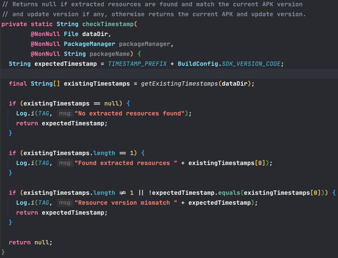 那有没有更好的办法呢?答案是自定义 ClassLoader。具体的,在构建 Flutter AAR 时,在源代码编译成 .class 阶段完成之后,将所有的插件、Flutter Embedding Jar 对应的 .class 文件搜集起来,打包成一个 DEX 文件放入 Flutter AAR 的 assets 中。在运行时,需要将 assets 下的 DEX 文件拷贝到应用的 data 私有目录下,再通过 DexClassLoader 去动态加载这个 DEX。这里需要注意的是 DEX 文件是版本号的概念的,它跟 Flutter AAR 的版本号是绑定的,意味着每次加载这个 DEX 时,我们首先需要检查当前私有目录下的文件版本是否与 Flutter AAR 版本一致,一致则直接加载即可,不一致需要删除原 DEX 文件并重新拷贝后再加载。关键代码如下: