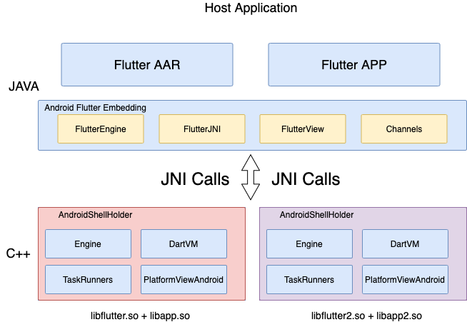 libflutter.so 是Flutter Engine 动态库文件,在运行时会被 Flutter Embedder Jar 加载进来。这个库文件冲突,我们不能单纯使用宿主中同名的库文件,因为两者的 Engine 版本可能不一致以及不违背运行时 Flutter 版本隔离的目标。