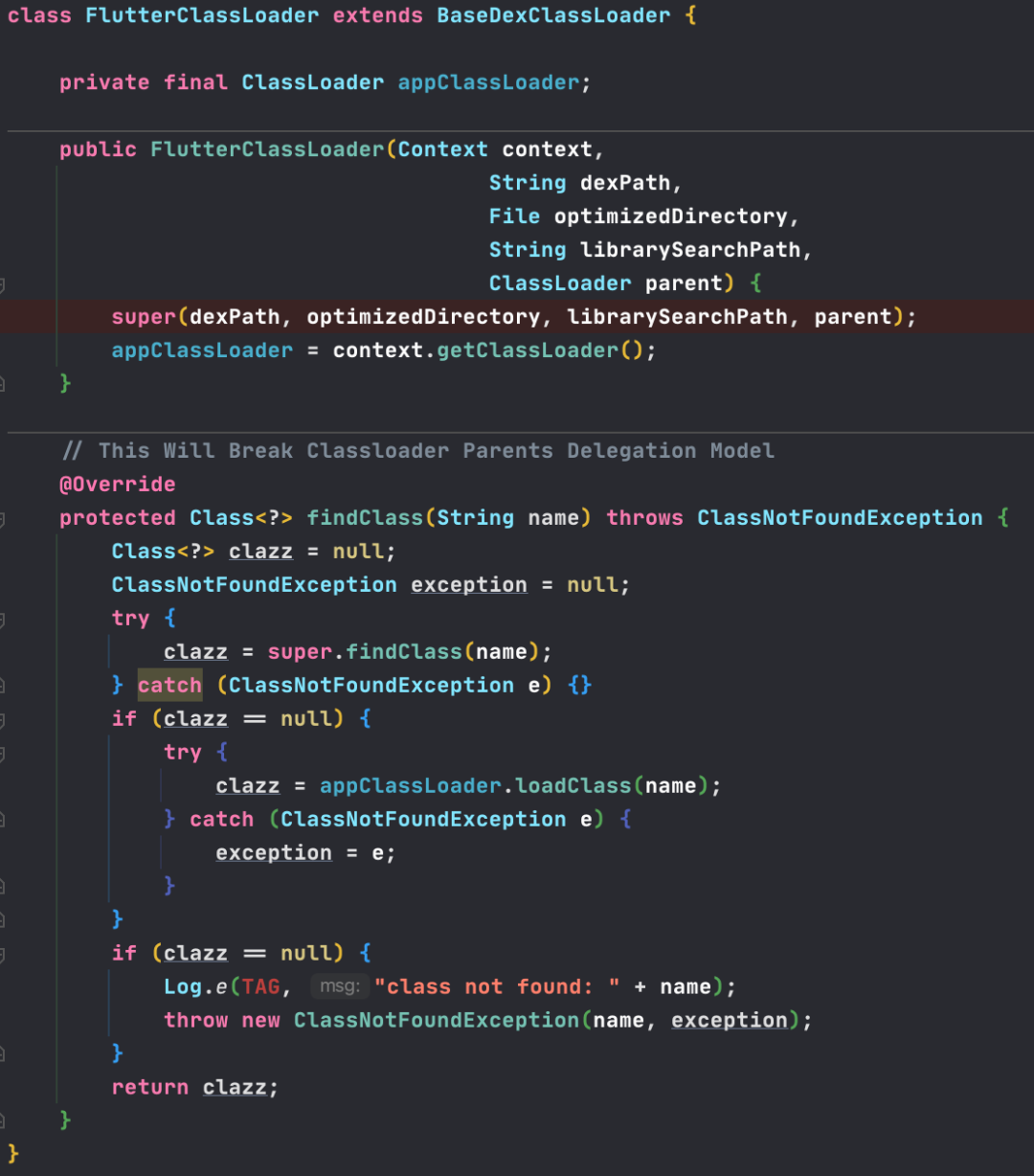 默认类的加载基于双亲委派模型,一般都是先请求父加载器加载,如果父加载器加载失败子加载器才有机会加载。但在这里,我们 findClass 的逻辑需要反其道而行之。Flutter AAR 需要加载的类应该优先使用子加载器从 DEX 文件中加载,加载失败后才能通过父加载器加载。代码如下: