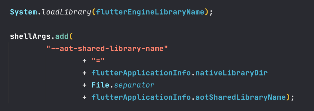 Flutter Engine 的初始化是在 FlutterLoader 这个类中,在这里会加载 libflutter.so 并配置一系列的参数初始化 Native Engine。我们需要做的就是替换 libflutter.so 的加载逻辑,转而去加载重命名后的 Engine 库文件。对于 libapp.so ,它并不是在 Java 层加载的,而是由 Native Engine 通过 dlopen 链接的。通过查阅 Engine 的代码我们发现通过 --aot-shared-library-name 选项可以设置要加载的目标 libapp.so 路径。关键代码如下: