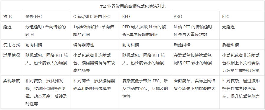 针对上述音频卡顿现象,我们该如何应对呢?表2列举了业界常用的音频抗丢包算法和相互对比。
