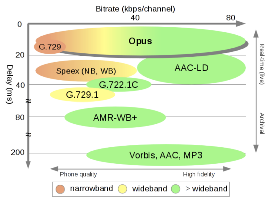 由此,我们可以得出结论,Opus(RFC 6716) 是唯一一个覆盖全频带的音频编码器,并且它有如下的特性: