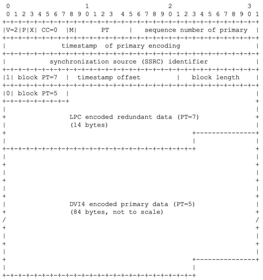 我们举一个实际的例子:一个 RTP 音频数据包,包括一个 DVI4(8KHz) 主编码块和一个单独的 8KHz LPC 编码的冗余块,两者长度均为 20ms。参照 RFC 2198 标准所定义,示例格式如图3所示。
