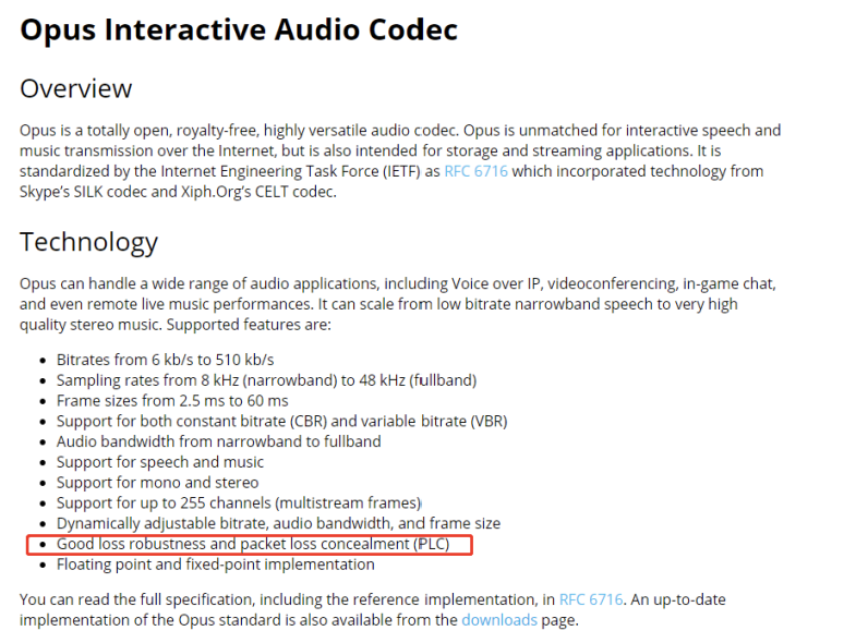 PLC(Packet Loss Concealment)丢包补偿是 Opus 编解码器中的一个可选项,在弱网传输场景下应该开启这个特征。