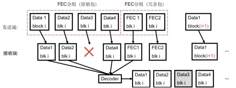 前向纠错也叫前向纠错码(Forward Error Correction,简称 FEC),是增加数据通信可信度的方法。FEC 利用数据进行冗余信息的传输,当传输中出现数据丢失时,将允许接收端根据已经接收的数据恢复丢失数据。