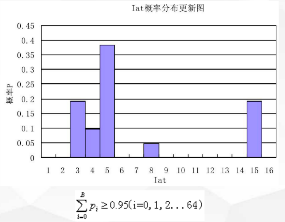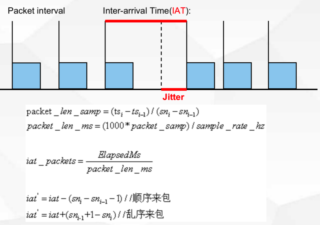 Jitterbuffer 模块的网络延时估计是以 IAT(inter arrival time)为基础的。IAT 的含义是相邻包到达时间间隔。通话时间越长,包间隔 IAT 的概率分布越稳定。观察周期内 IAT 的整体概率分布之和近似为1。一般采用 95% 作为满足统计概率的阈值,计算出 Jitterbuffer 的目标值大小。