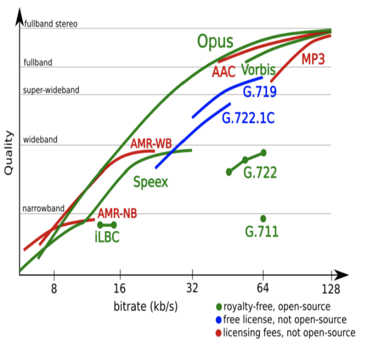 图中绿色线条代表的是无专利要求且开源的编解码器,其中 G.711 和 G.722 是 ITU 早期应用于电信网络的语音编码标准,相应只支持窄带和宽带频率范围,码率相对固定,压缩率较低。蓝色线条代表的是无专利要求但是闭源的编解码器,相比 G.711 和 G.722,它们支持的频带更广。最后,红色线条代表的是有专利要求并且闭源的编解码器,其中 AAC 和 MP3 是 Fraunhofer 主导制定的音乐编解码器标准,广泛应用在数字音乐领域。