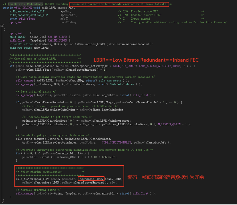 具体到 Opus 编码器内部实现,inband FEC 是通过 LBRR(Low Bitrate Redundant)帧实现的。LBRR 帧包含了前一个音频帧的信息,和当前帧一起打包编码。图12是 LBRR 帧的编码代码。