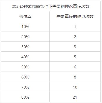 各种丢包率条件下需要的理论重传次数如表3所示。