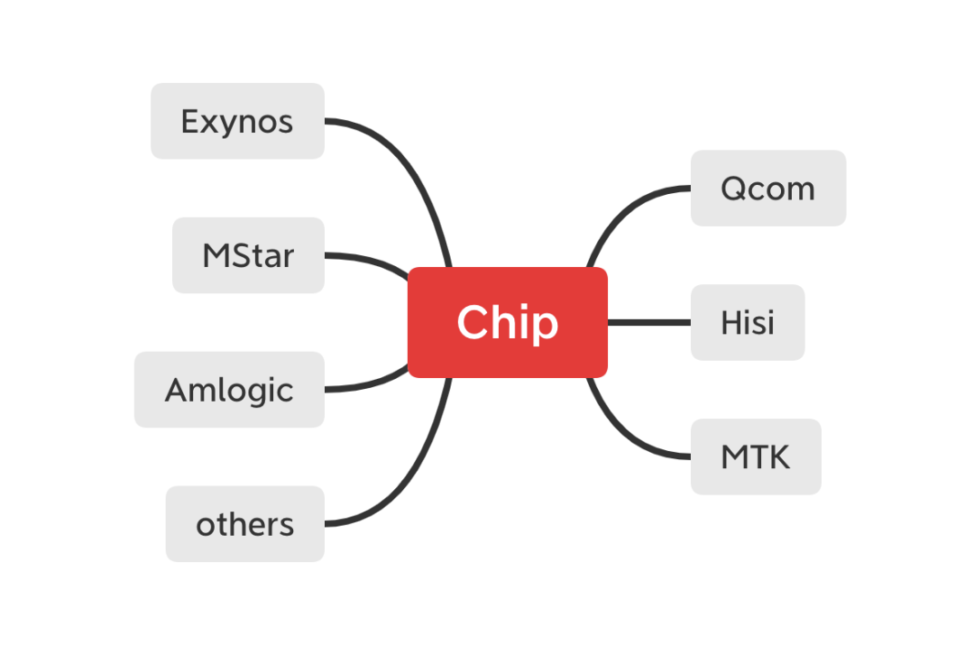 主流 SOC (System On Chip)方案都是基于 Linux/Android 系统开发,但是各家却各有所长。高通 SOC 主要应用在手机设备上,编解码性能和稳定性都比较强大,视频超编问题控制的比较好;MTK 和 MStar 并购后,除了手机产品,在机顶盒和大屏产品上应用很广,往往可以通过 MTK 自有参数,开启一些功能。此外不同的芯片版本计算性能高低不同,计算性能高低不同会影响音视频功能的开启,比如视频的前后处理。目前主流的芯片方案如下图: