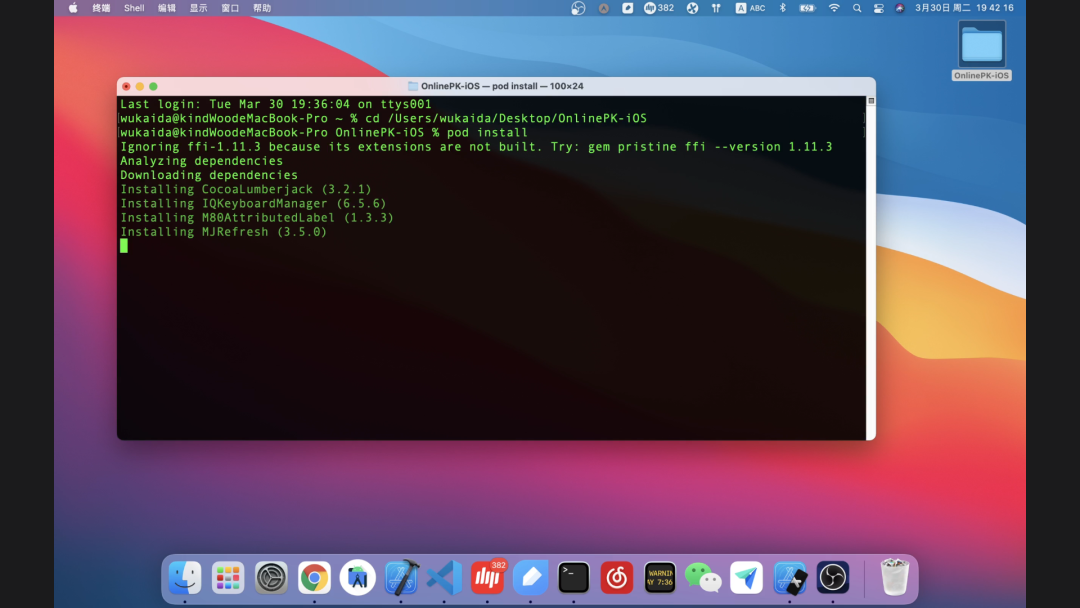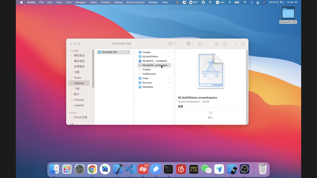 解压后,取出iOS端Demo工程,打开终端,执行pod install命令;