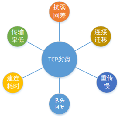 TCP 无私的传输特性,导致传输慢,效率较低,在弱网下更明显。
