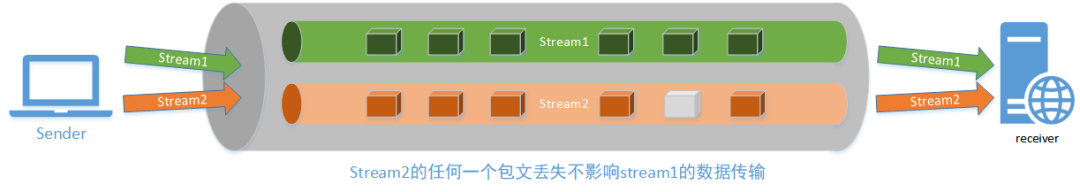 应用层的协议数据通过流交换信息,每个流内是有序序列的字节,而流之间没有顺序关系,流与流之间是相互隔离,相互独立的。如果某个流出现丢包或者传输不可达,不会影响连接中其他流的数据。这样设计可以避免 TCP 协议中的队头阻塞,我们需要做的是把不同优先级的数据进行隔离即可。