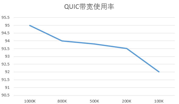 我们还做了在带宽受限的情况下,QUIC 对于带宽的使用率,基本上 QUIC 对于带宽的使用率都能达到90%以上,然而 TCP 就要差很多。