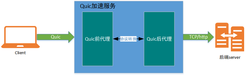 接受后端服务器的业务包,并且进行压缩和正校验在送给前端代理模块,由前代理模块进行 QUIC 协议转发。