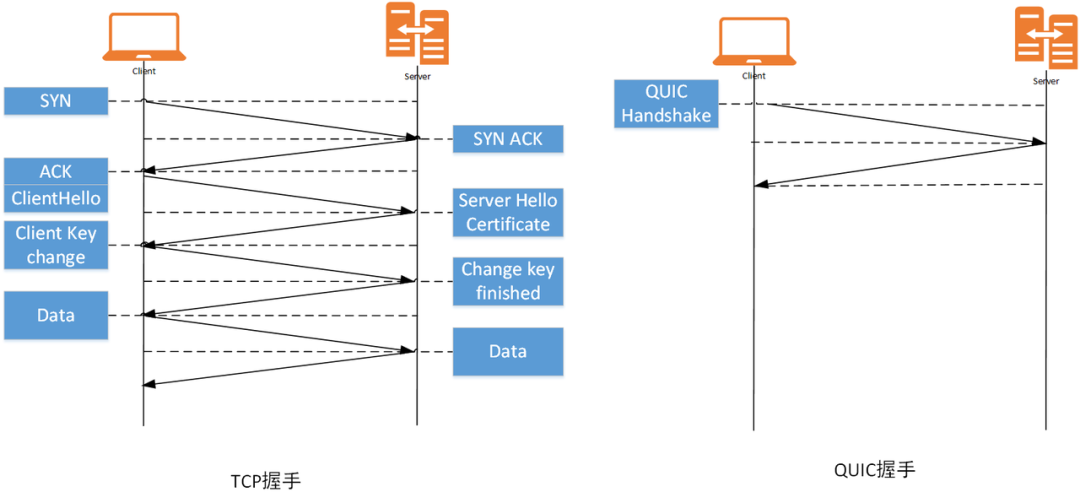 QUIC 协议做的最大优化即简化握手流程到 0/1RTT。众所周知,HTTPS 的握手需要 3RTT 的耗时,然而 QUIC 建联最多只消耗 1RTT。如下图,说明了 TCP 的握手繁琐流程,然而 QUIC 将该繁琐流程降低到了 0-1 个 RTT。