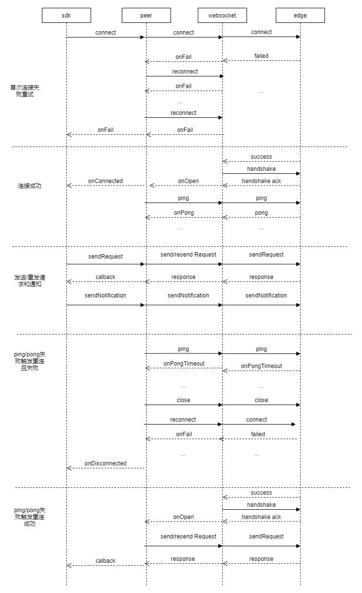 场景二:连接成功后的断开重连策略。如果已经连接成功,因为网络原因或者服务器等原因导致连接断开,则触发此策略。触发方式分为两种,一种方式是,WebSocket 通知了 onClose 事件;另外一种是主动探测的方式,通过 ping/pong 机制来触发重连。后者通过发送 ping 帧三次,每次间隔 3s,超时1.5s,如果三次均无法得到 pong 帧,则认为网络或者服务器异常,触发此场景的重连策略。具体的策略是,每隔 2/4/6s 触发一次连接尝试,如果最终还是失败的话,回调给应用层 onDisconnected 事件。