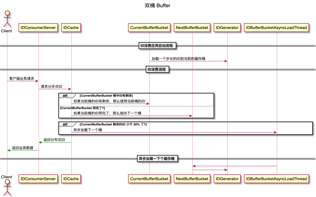 其主要原理为:设计两个缓存桶:currentBufferBucket 和 nextBufferBucket,每个桶都存放一个步长这么多的 ID,如果当前缓存桶的 ID 用完了,那么就将下一个缓存桶设置为当前缓存桶。