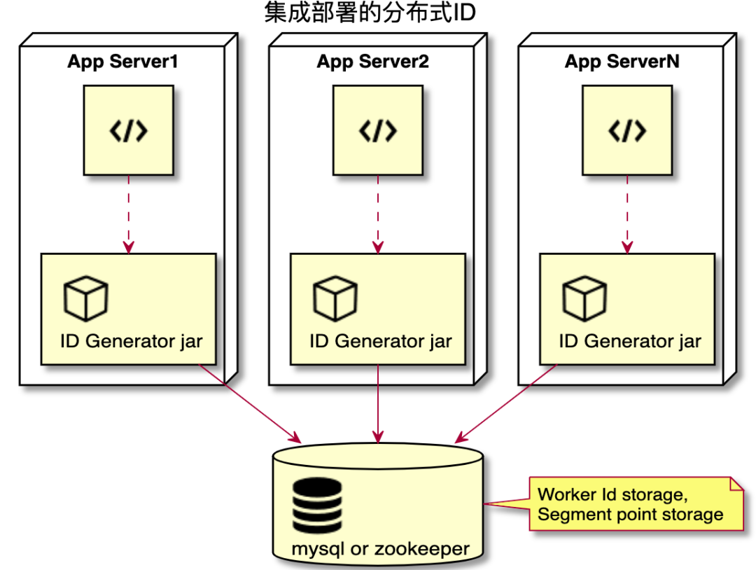 当使用 ID 的应用节点比较少时,比如 200 个节点以内,适合使用集成分布式部署方式。每个应用节点在启动的时候决定了机器号后,运行时不依赖任何第三方服务,在本地使用时间戳、机器号、以及毫秒内并发序列号生成 ID。