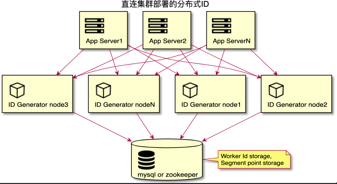 下图展示的是应用服务器通过引入 jar 包的方式实现获取分布式 ID 的过程。每一个使用分布式 ID 的应用服务器节点都会分配一个拓扑网络内唯一的机器号。这个机器号的管理存放在 MySQL 或者 ZooKeeper 上。
