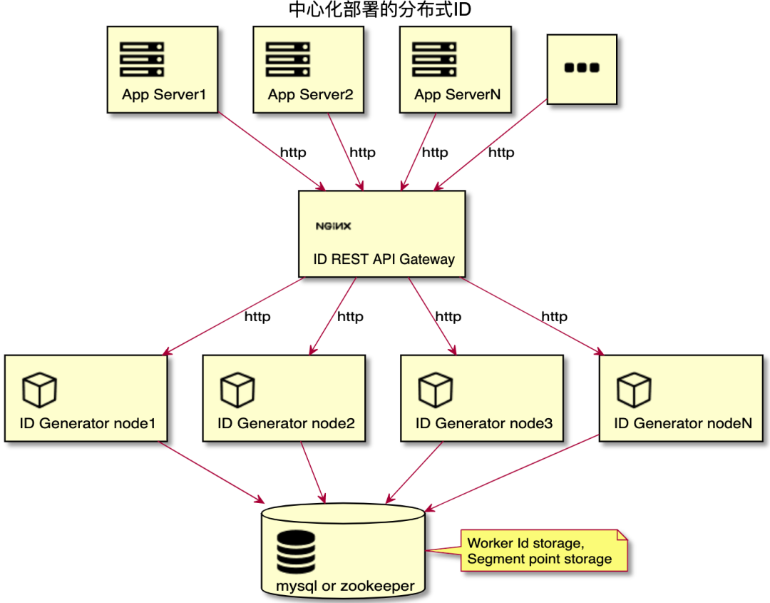 使用 ID 网关组网后,应用服务器通过 HTTP 或 RPC 请求 ID 网关获取分布式 ID。这样相比于上面的集成分布式部署方式,就可以支撑更多的应用节点使用分布式 ID 了。