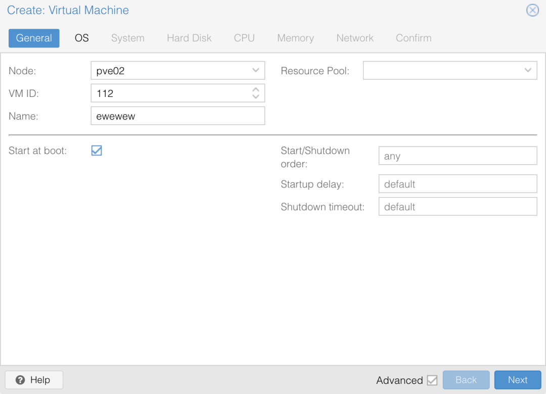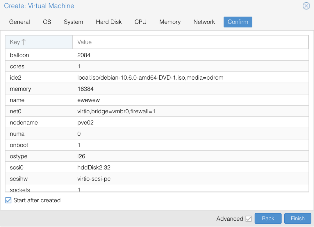 注意要勾选 Advanced 选项,选中 Start at boot,这样就算 Proxmox 机器重启,你的虚拟机也会自动启动。