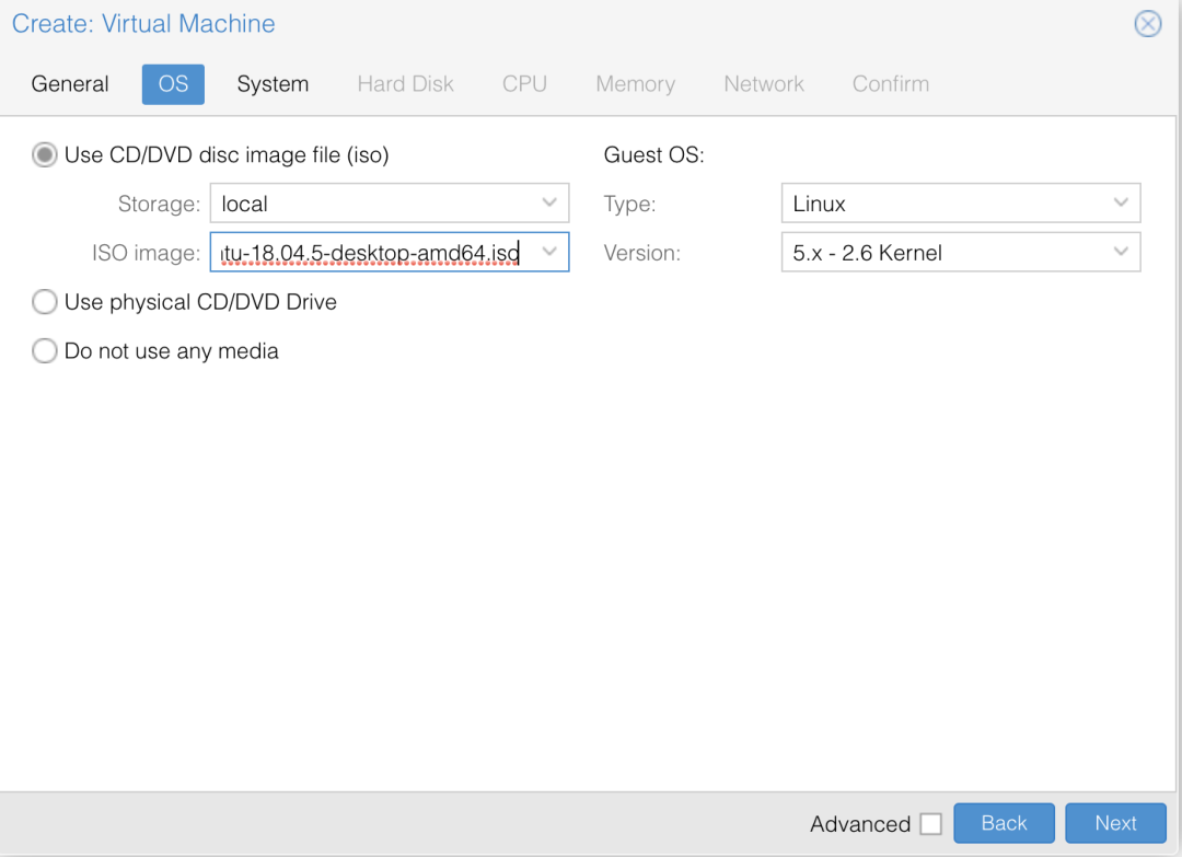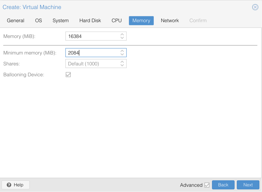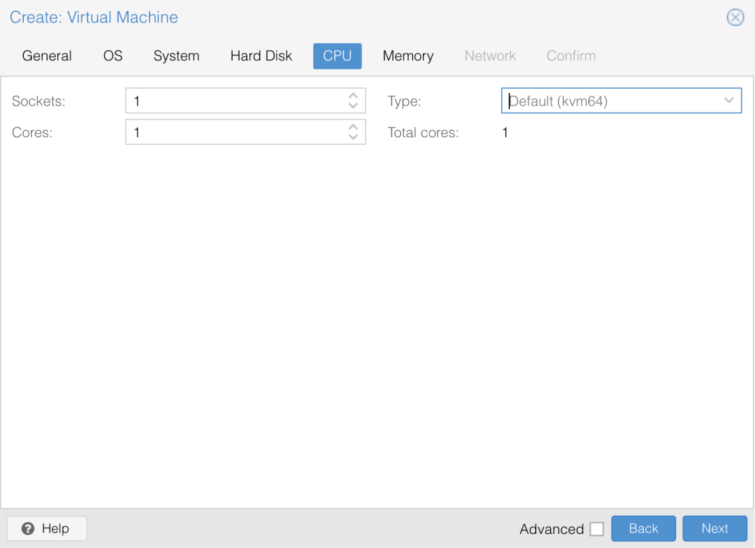 CPU 一般可以选择 2 个 Core,Sockets 插座意味着物理 CPU 的数量,因此实际 Total Core 是他们相乘的结果。如果你需要超强的性能,你可以设置32核,甚至更多,Proxmox 会动态分配 CPU 计算力,如果只有你的任务在执行,那么则会分配至高到你的设置数值。