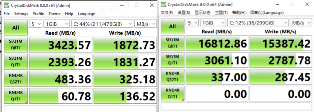 左侧为一台普通联想 PC 的磁盘读写性能,右侧是一台 Proxmox Windows RAID 磁盘的性能,可以对比看出使用了 Proxmox 后文件读写直接提高了8~10倍。