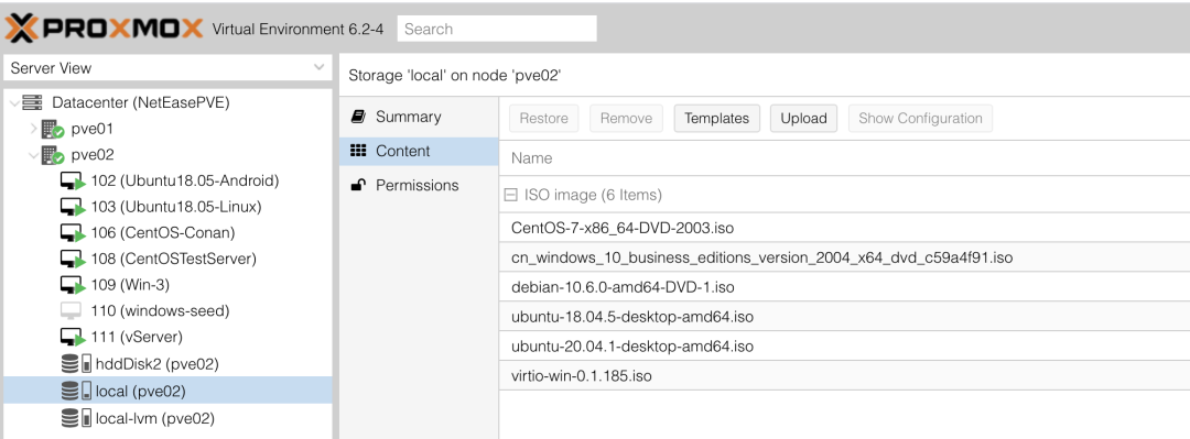 安装操作系统的 ISO 都是放在/var/lib/vz/template/iso 目录下面。一般可以使用 ssh 命令登录到 Proxmox 终端,直接命令行下载操作系统,也可以支持 SFTP 直接传输,甚至是 NFS 的方式去挂载远程磁盘。