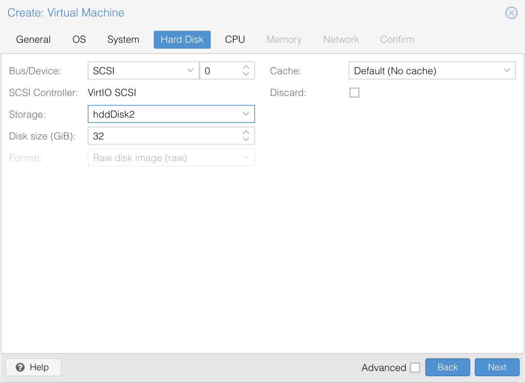 磁盘就要根据需求选择 HDD 还是 SSD,设置容量大小,Cache 模式默认即可,一般来说 Write Back 模式可以获得更好的性能。