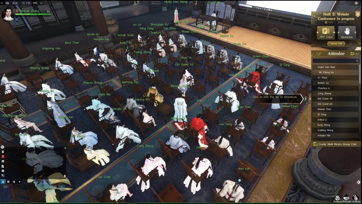 网易技术实力不止于此,这套沉浸式会议系统融合了六项专利技术,可以实现免下载随时使用、嵌入式播放PPT、文字或语音群聊及私聊、随时切换多场会议等数十种会议功能。此次会议还设有一站式管理后台,拥有人员设置、会议流程、数字广告、数据分析、新媒体墙展等大型线上会议管理功能。此外,在AI技术的辅助下,会议的细节变得更加丰富、生动,大大提升了参会体验,学者可以使用AI智能捏脸技术生成个人形象照,还可身穿古风服装虚拟形象大合影。