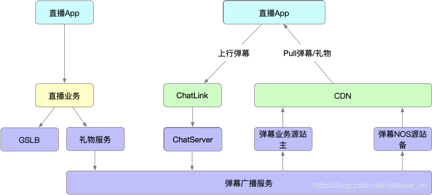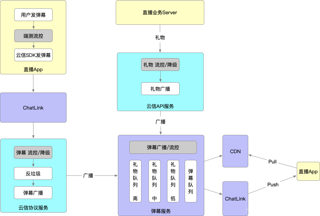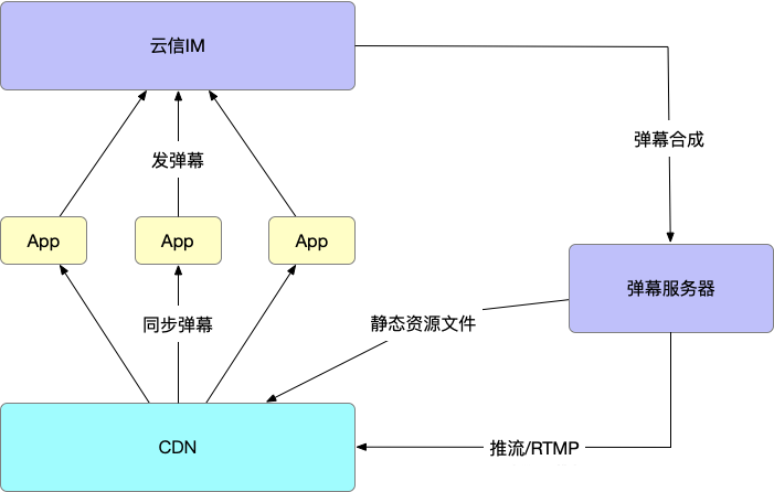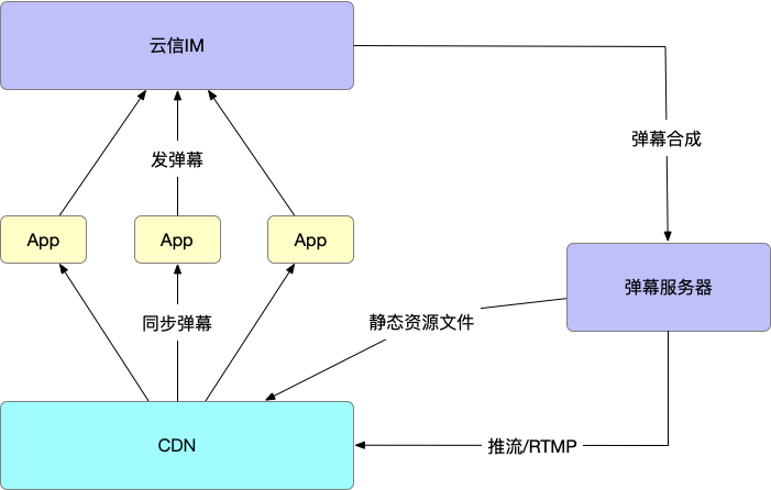 弹幕方案以云信聊天室服务为基础,提供登录直播间、发送弹幕、礼物消息等能力;以千万级在线广播为目标,设计了基于CDN的弹幕广播服务。