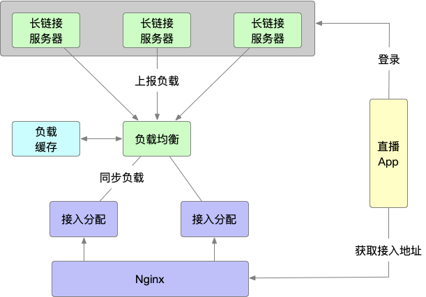 云信实现了一套基于服务器负载均衡的分配策略。长链接接入服务器周期性上报当前服务器负载到负载均衡服务集群,负载信息存储在共享缓存中,接入分配服务根据负载信息动态分配接入地址。