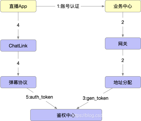 用户打开直播App,首先完成账号鉴权。在进入TFBOYS直播间时通过业务中心完成直播付费身份认证和弹幕服务地址分配(同步获取到弹幕服务的动态鉴权token),最后根据接入地址登录弹幕服务,弹幕服务依据鉴权中心的策略校验Token正确性。