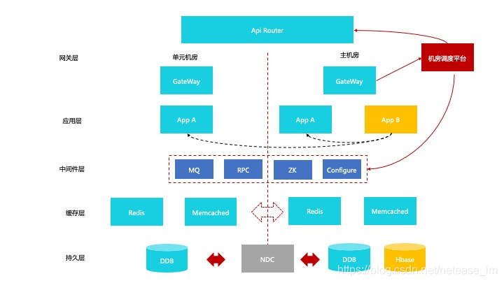 如上图所示,非单元化的业务部署在主机房,单元化的业务则部署在主机房和单元机房。