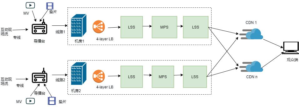 整个推流链路采用双路热流,互为主备,且部署上是互相独立的两个单元,能做到支持Rack级别的故障灾备。双路热流实现了自动主备切换,端上无需专门添加应用层的线路切换逻辑。当任何一个链路出现问题的时候,观众的直播流不会受到影响,端上平均卡顿感知时间在1s以内。