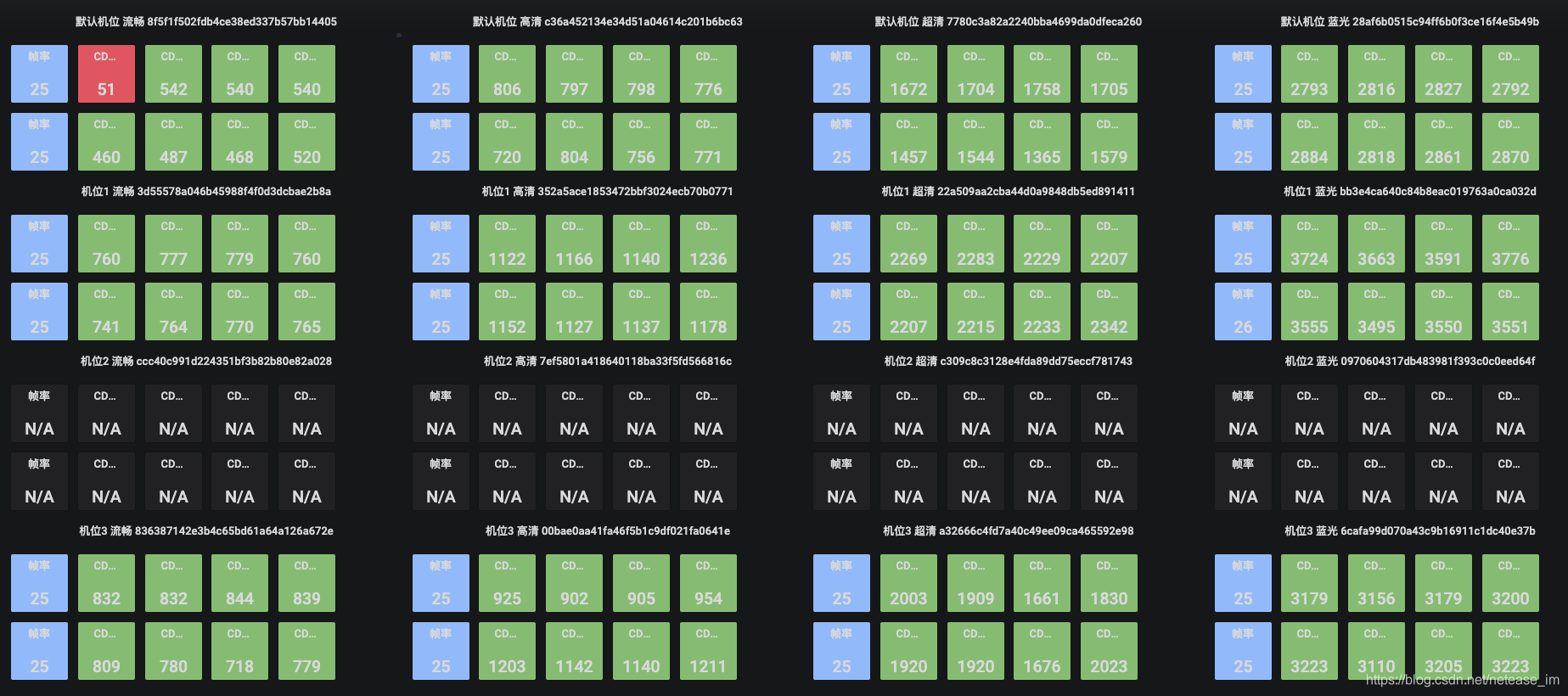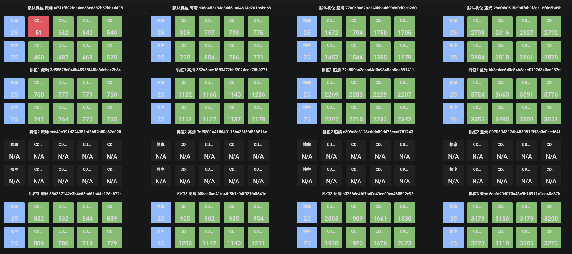 以下图为例:蓝色表示上行帧率,绿色表示正常的上行码率,红色表示码率值过低,N/A表示当前没有上行推流数据。
