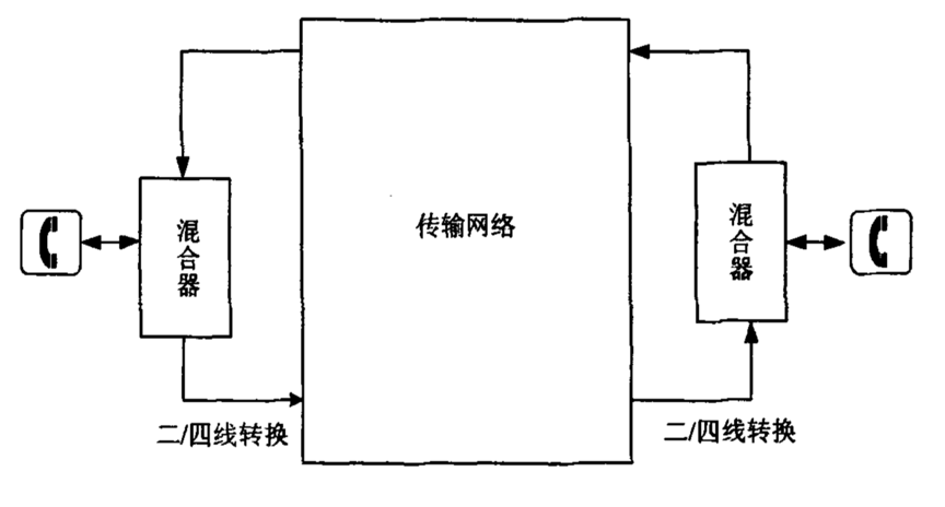 通话中听到的回声一般有两种,线路回声和声学回声。线路回声是因为在长途电话线网络中,存在二四线转换的问题。本地电话—般是用二线电路连接到中心局的,而长途线路的话,需要用四线电路,这两者之间需要用混合变换器进行连接。混合变换器的引入使得传输的信号在混合变换器阻抗不匹配的情况下产生电路回声。