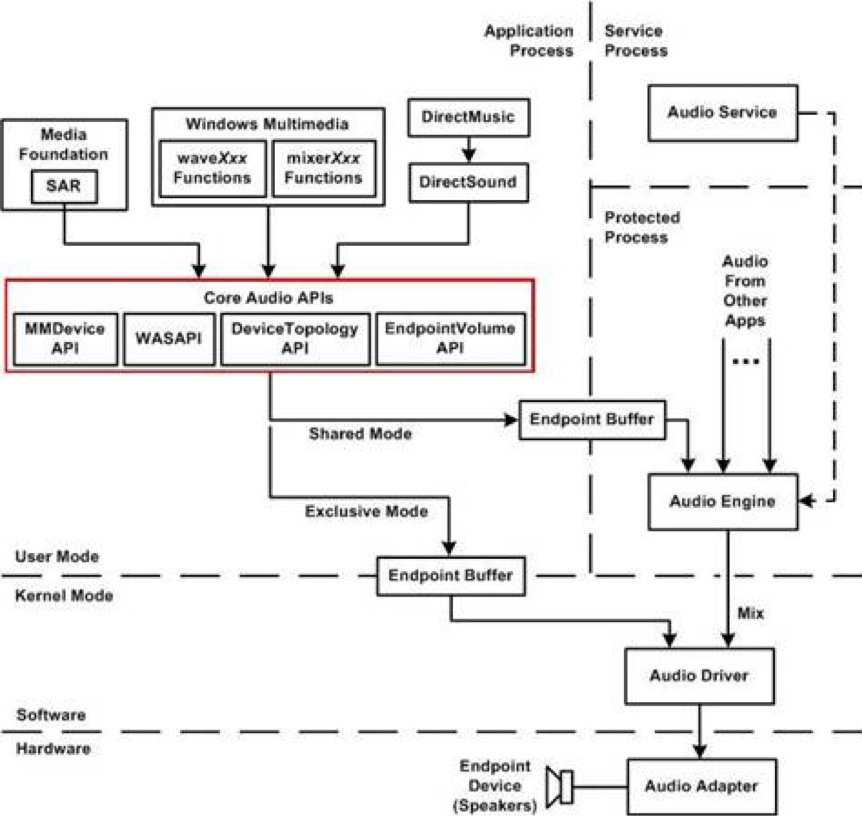 Windows Vista 之后系统,音频系统相比之前的系统有很大的变化,产生了一套新的底层 API 即 Core Audio APIs 。该低层 API 为高层 API( 如 Media Foundation( 将要取代DirectShow 等高层 API) 等 ) 提供服务。该系统API具有低延迟、高可靠性、安全性等特点。